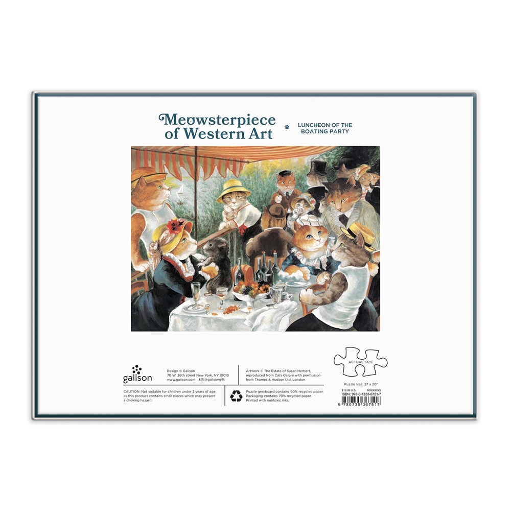 Le puzzle Meowsterpiece du Déjeuner de la fête nautique est une parodie pleine d'esprit et affectueuse de l'oeuvre emblématique de Renoirs par l'artiste féline Susan Herbert ! Les puzzles Galison sont emballés dans des boîtes robustes au fini mat, parfaites pour offrir, réutiliser et ranger. • 1 000 pièces • Taille de la boîte : 11,25 x 8,25 x 2", 86 x 210 x 51 mm • Taille du puzzle : 27 x 20", 508 x 686 mm • Comprend un insert de puzzle • Peu de poussière de puzzle