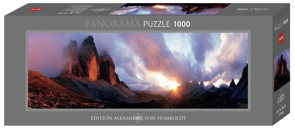 Puzzle 1000 pièces. panorama 3 Peaks de la marque HEYE et la série Alexander Von Humboldt - Dimensions du puzzle monté : 95 x 33 cm - Label FSC (ce label environnemental a pour but d'assurer que la production de bois ou d'un produit à base de bois respecte les procédures garantissant la gestion durable des forêts)