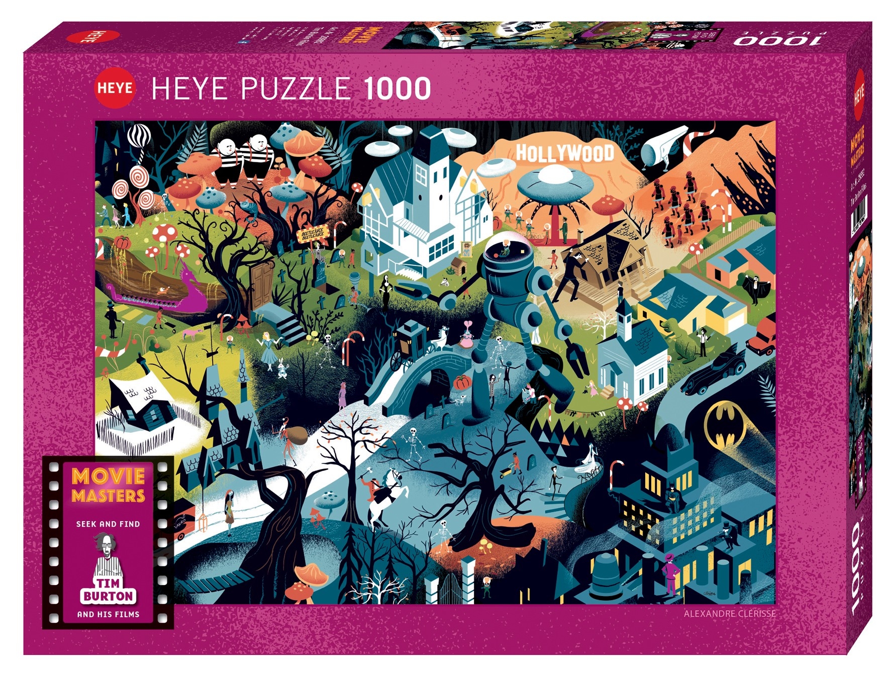 Puzzle 1000 pièces. Tim Burton Films de la marque HEYE, de la série Movie Masters et de l'artiste Alexandre Clérisse - Dimensions du puzzle monté : 50 cm x 70 cm - Label FSC (ce label environnemental a pour but d'assurer que la production de bois ou d'un produit à base de bois respecte les procédures garantissant la gestion durable des forêts)