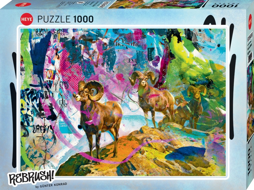 Puzzle 1000 pièces. Big Horns de la marque HEYE, de la série Rebrush ! et de l'artiste Gunter Konrad - Dimensions du puzzle monté : 50 cm x 70 cm - Label FSC (ce label environnemental a pour but d'assurer que la production de bois ou d'un produit à base de bois respecte les procédures garantissant la gestion durable des forêts)