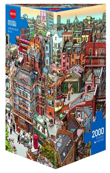 Puzzle 2000 pièces. Sherlock & Co de la marque HEYE, de la série Cartoon Boîte triangulaire et de l'artiste Göbel & Knorr - Dimensions du puzzle monté : 69 cm x 97 cm - Label FSC (ce label environnemental a pour but d'assurer que la production de bois ou d'un produit à base de bois respecte les procédures garantissant la gestion durable des forêts)