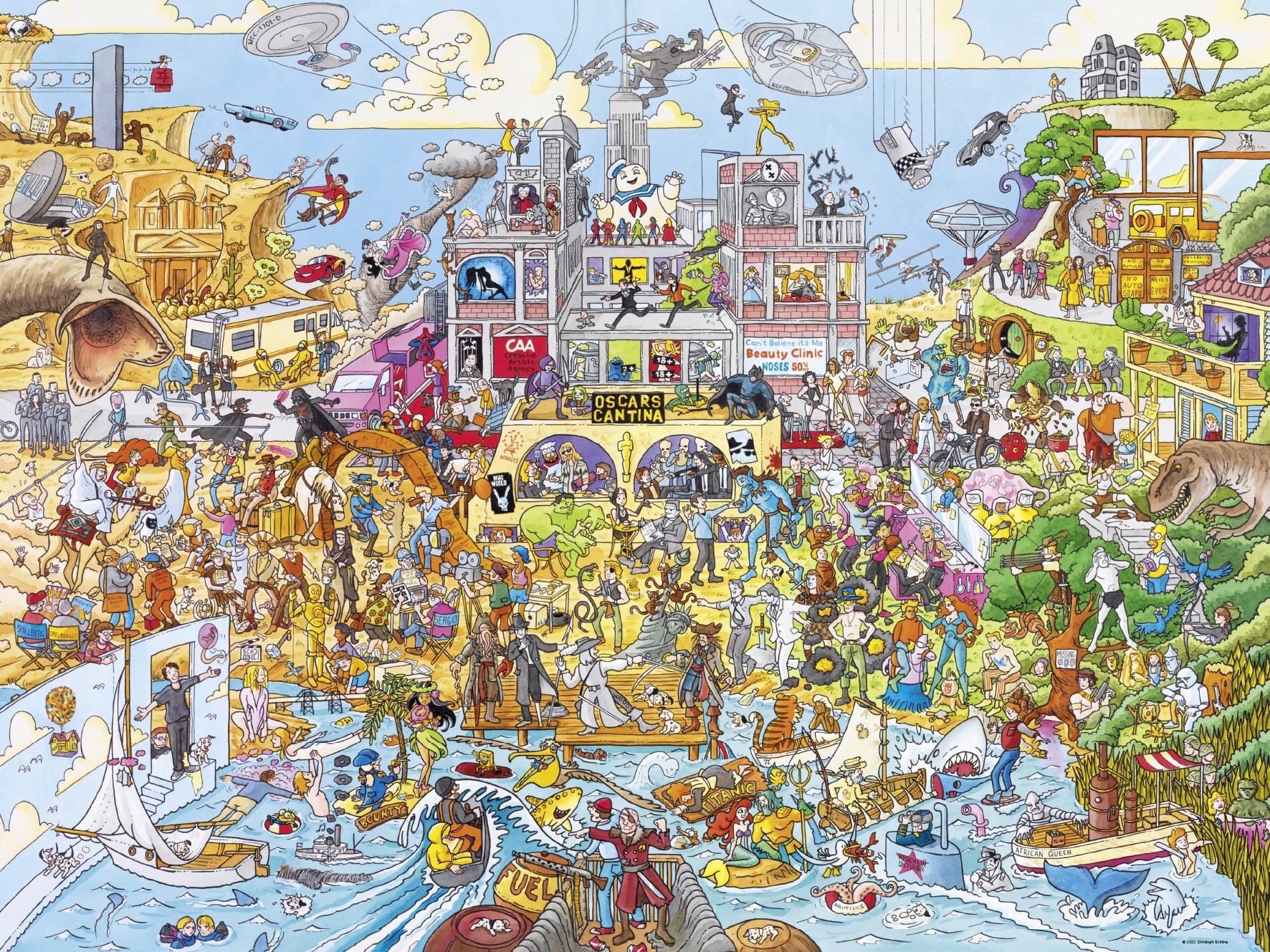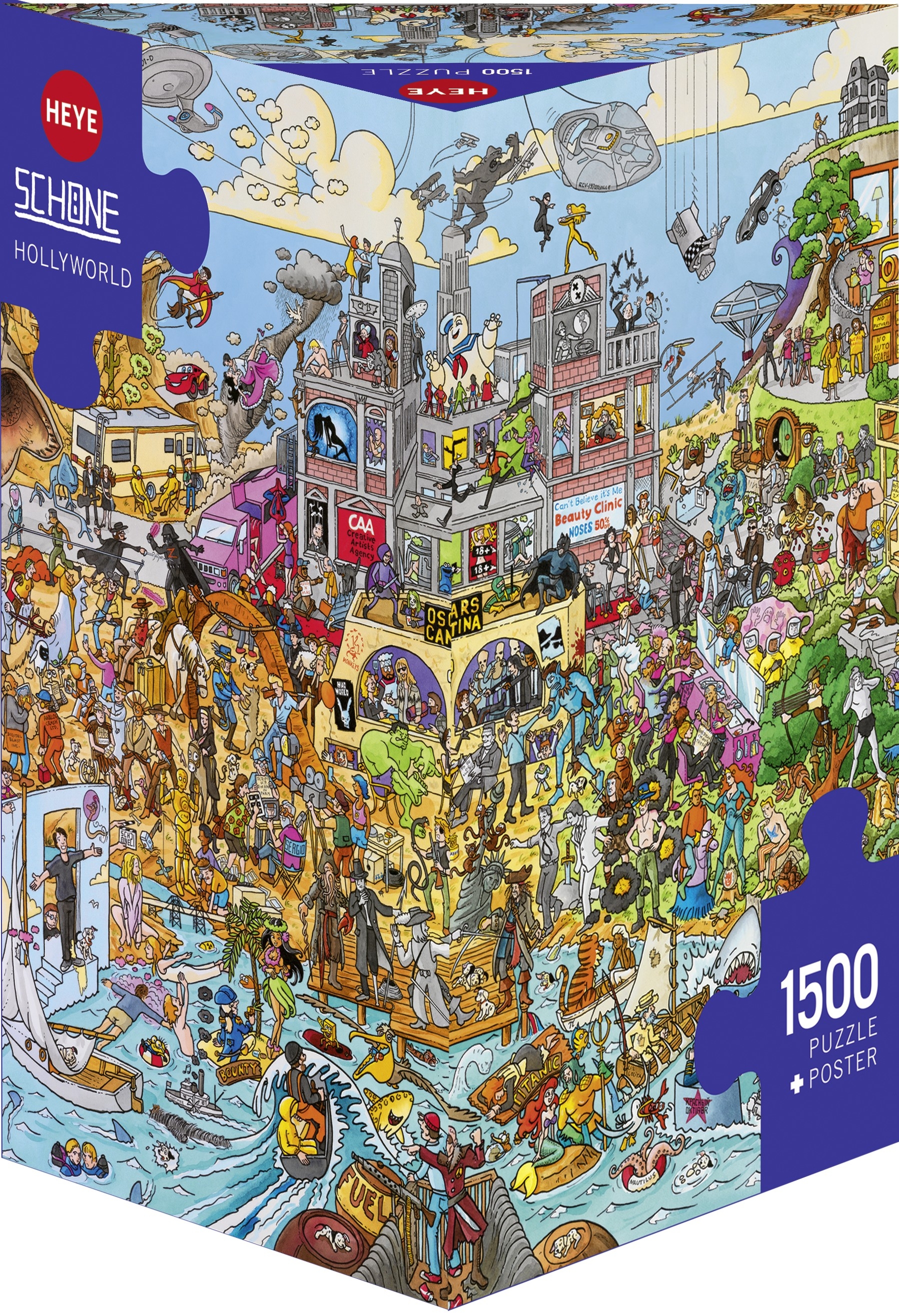 Puzzle 1500 pièces. Hollyworld de la marque HEYE, de la série Cartoon Boîte triangulaire et de l'artiste Christoph Schöne - Dimensions du puzzle monté : 60 cm x 80 cm - Label FSC (ce label environnemental a pour but d'assurer que la production de bois ou d'un produit à base de bois respecte les procédures garantissant la gestion durable des forêts)