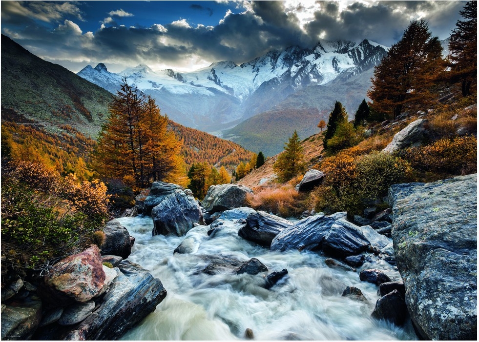 Puzzle 1000 pièces. Mountain Stream de la marque HEYE et la série Alexander Von Humboldt - Dimensions du puzzle monté : 50 x 70 cm - Label FSC (ce label environnemental a pour but d'assurer que la production de bois ou d'un produit à base de bois respecte les procédures garantissant la gestion durable des forêts)