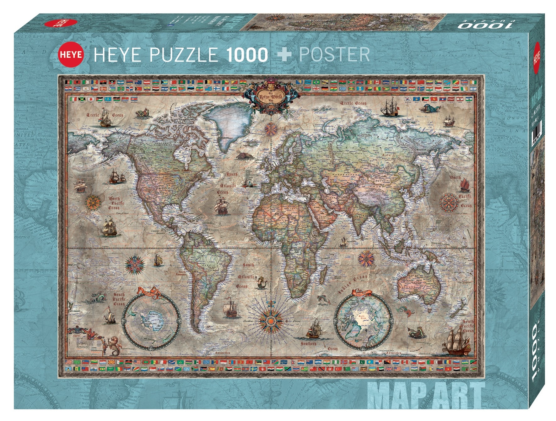 Puzzle 1000 pièces. Retro World de la marque HEYE, de la série Map Art et de l'artiste Rajko Zigic - Dimensions du puzzle monté : 50 cm x 70 cm - Label FSC (ce label environnemental a pour but d'assurer que la production de bois ou d'un produit à base de bois respecte les procédures garantissant la gestion durable des forêts)