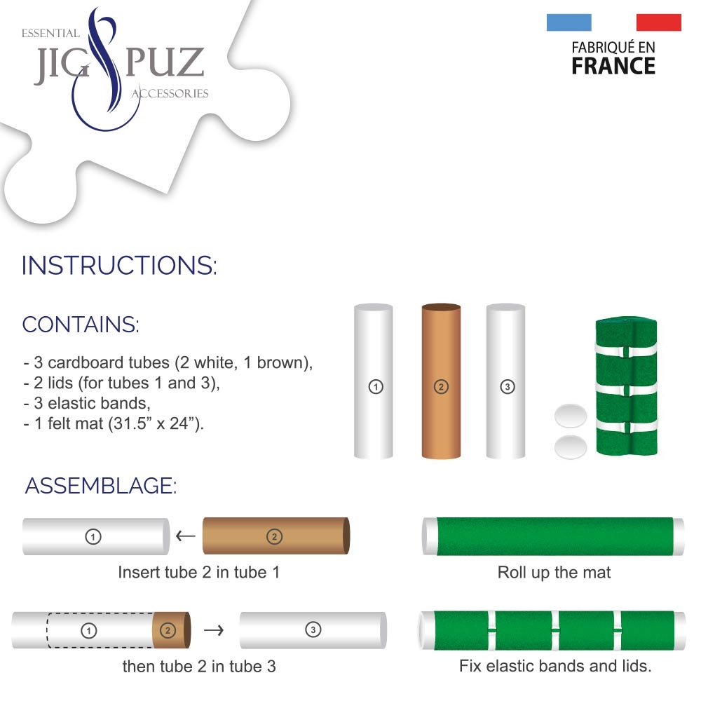 Tapis de Puzzles - 300 à 1000 pièces - Jig & Puz Ce tapis de puzzle est parfait pour assembler, transporter et ranger vos puzzles de 300 à 1000 pièces sans les abîmer. Fabriqué en France par Jig & Puz, il garantit une surface stable et antidérapante pour un confort optimal. Ses dimensions de 80 x 61 cm conviennent aux formats de puzzles les plus courants. Veuillez noter que la couleur du tapis est non contractuelle et peut varier par rapport aux photos.