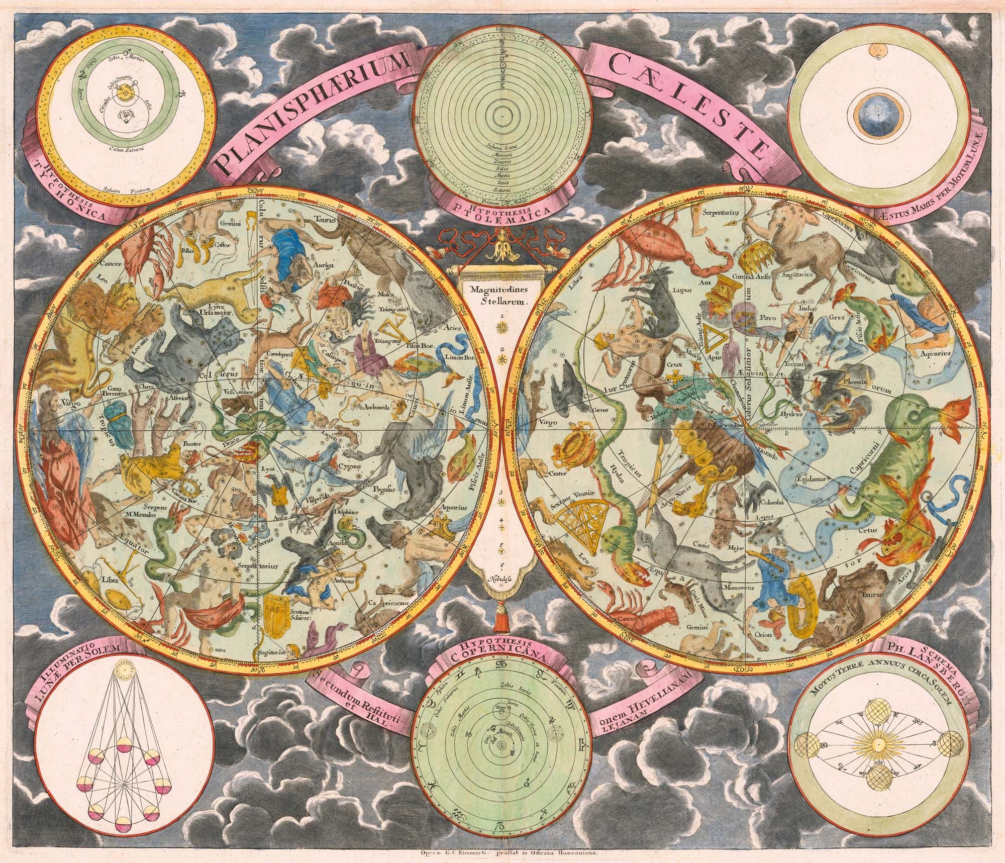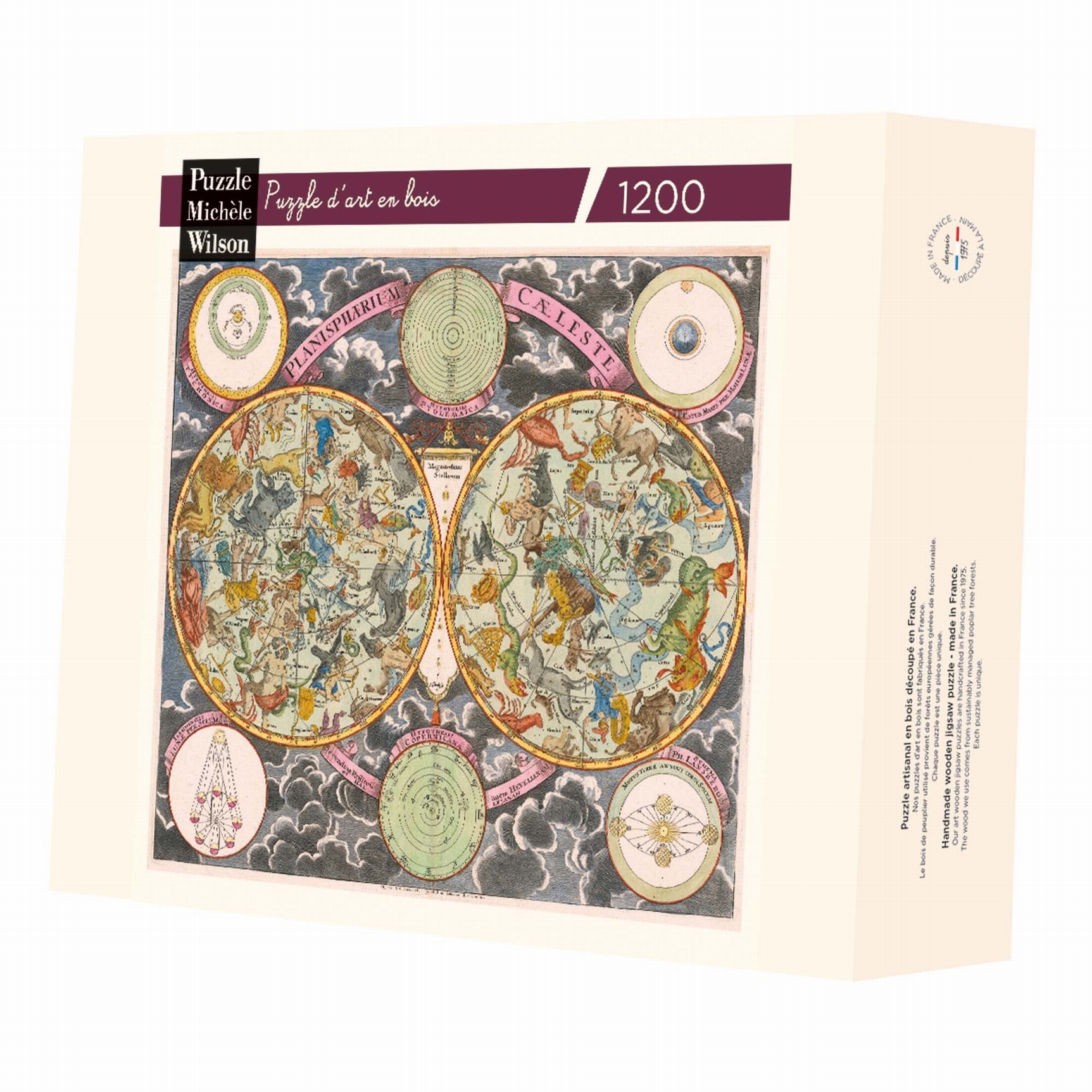 Puzzle d'art en bois de 1200 pièces, découpé à la main en France respectant l'environnement. Cette carte céleste de Georg Christoph Eimmart est datée du 17e siècle. Elle montre les constellations et les signes du zodiaque des hémisphères Nord et Sud représentés sous forme de figures allégoriques. Encadrée par des diagrammes illustrant divers modèles cosmologiques, cette carte témoigne de l'évolution de la compréhension de l'Univers à cette époque. Chaque pièce de ce puzzle vous invite à découvrir un monde où l'imagination artistique rencontre la quête de connaissance pour éclairer les secrets du cosmos ! La découpe de ce puzzle souligne la variété des formes qui composent cette grande carte : les figures allégoriques tout en couleur, les inscriptions latines, les données et les schémas scientifiques. Un fond nuageux ajoute une touche de mystère et de profondeur. Dimensions : 53 x 45,5 cm environ #Automne24